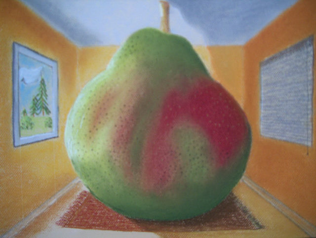 | This drawing was an exercise in a recent art class. The object was to create an image of a large fruit in a small room ala Rene Magritte. |